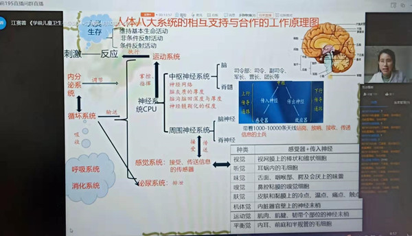 江赛蓉老师讲授《学前儿童卫生与保健》课。江老师认为,网络教学对教师的教学能力和素养提出了更高的要求,教学语言要求更简洁规范,教学目标要更明确,重、难点要更突出,教学方式要可视化、生活化等。针对这些要求,以达“线上线下等效”教学效果,她从课前、课中和课后三个环节下功夫。课前做好三点:一是教师要把握本课程在整个课程体系中的定位与主要任务,清晰“森林”与“树木”的关系,从而确定课程教学目标。二是在教学设计上秉持“道而弗牵”、“开而弗达”的理念,留给学生足够的参与机会和思考空间,促使学生跟着课堂节奏走。三是PPT课件设计制作要图文并茂、动静结合。课中做好两方面的功课:一是斟酌知识点呈现顺序,易于学生理解掌握。二是专业知识呈现要可视化、生活化,吸引学生注意力。比如在本课程中,人体八大系统可比喻成电脑的各个部件,八大系统的功能与电脑各部件的功能做类比。课后要及时布置作业,巩固所学知识。