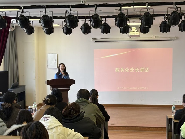 郑梅青副处长高度肯定了教育学院在技能培养方面的扎实工作和优异成绩,鼓励师生继续保持奋进姿态,将赛事经验转化为教学相长的持续动力,推动人才培养质量不断提升。