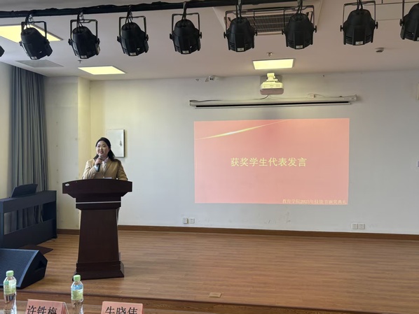 获奖学生代表陶艾源在发言中分享了备赛参赛的心得,表达了对学校培养和老师指导的感谢,并表示将以技能节为新的起点,继续精进技能、勇于实践,力争在更广阔的舞台上为校争光。