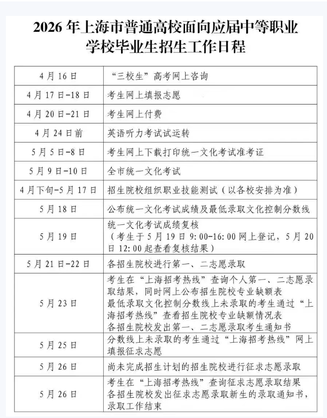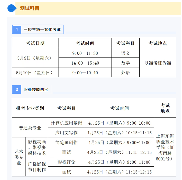 注:申请职业技能测试免试的考生必须参加语数外上海市统一文化考试。